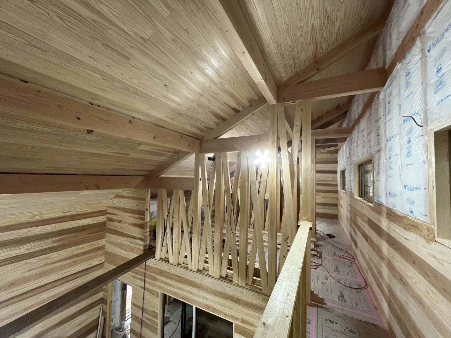 2階は暖かい空気がいきわたるように、化粧筋かいで特徴的な間仕切りとなっています。