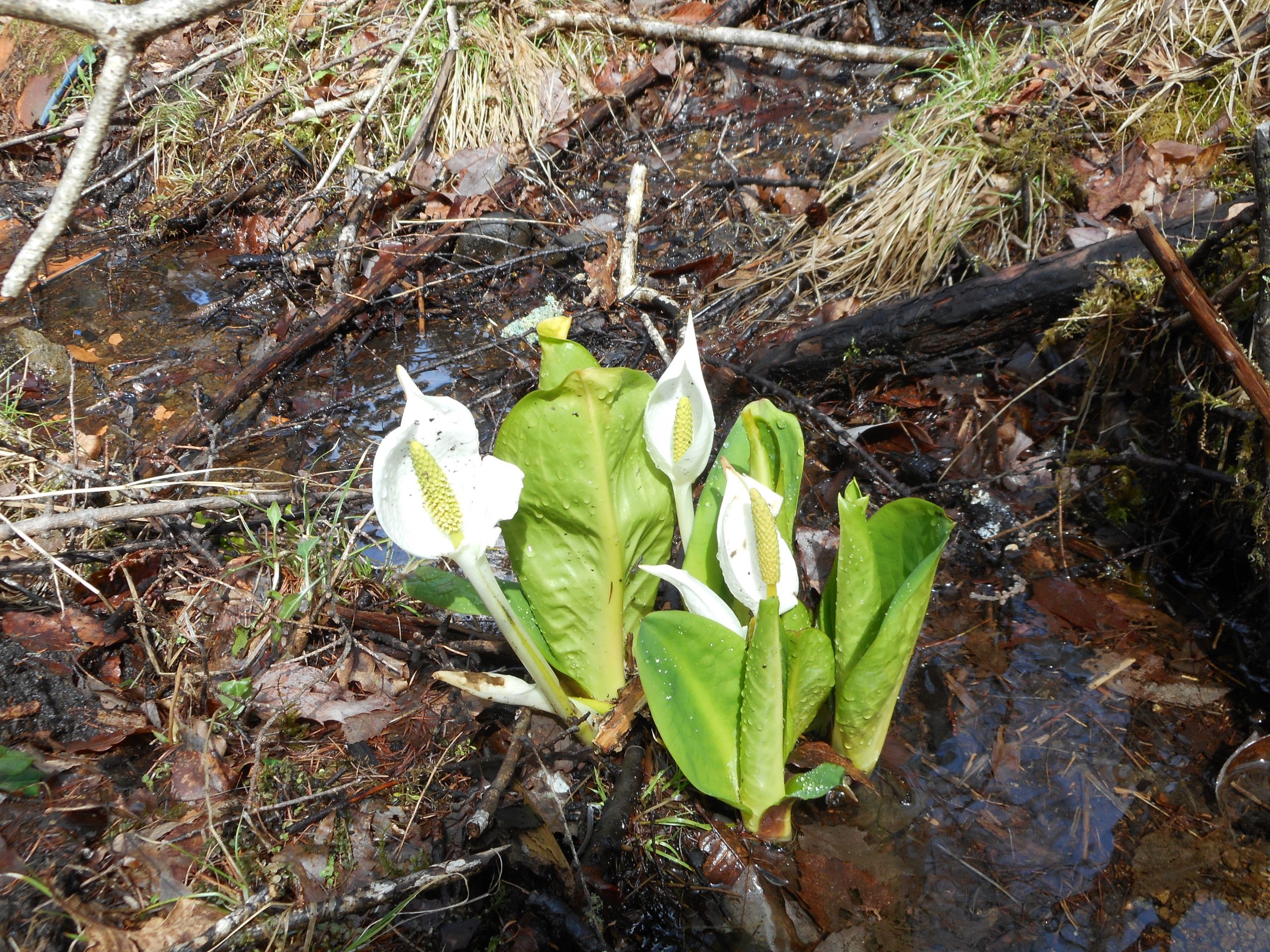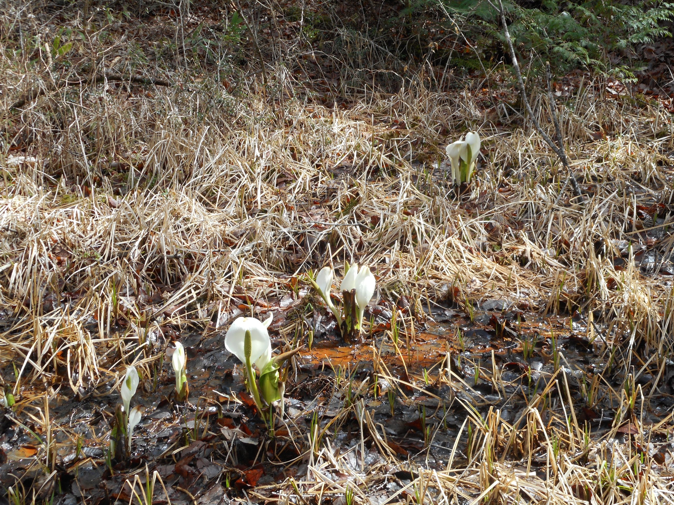 別荘地内では雨が降り流れる水の中、ミズバショウの花が咲き始め3月が暖かな日多かったので今年は1週間ほど例年より早く咲き始めましたが山菜も早まる気もしますが意外と山菜は例年並みだったりします