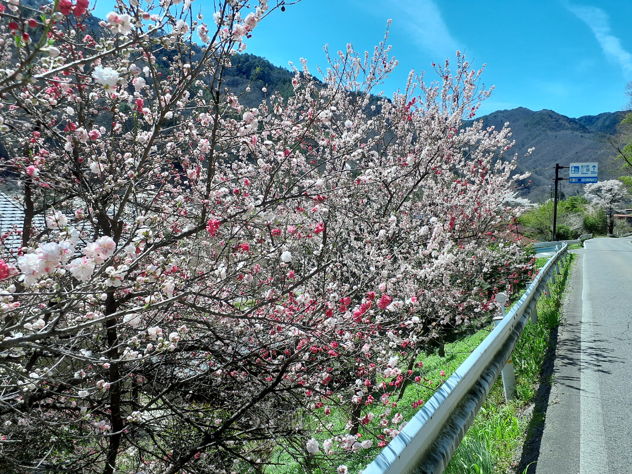国道19号線より三岳地区に入ると桜の花が満開になり三岳道の駅付近に咲くハナモモの花も咲きほころび今日は風もなく穏やかな日で今週は好天の日が続くためしばらくの間、桜の花やハナモモの花が楽しめそうです
