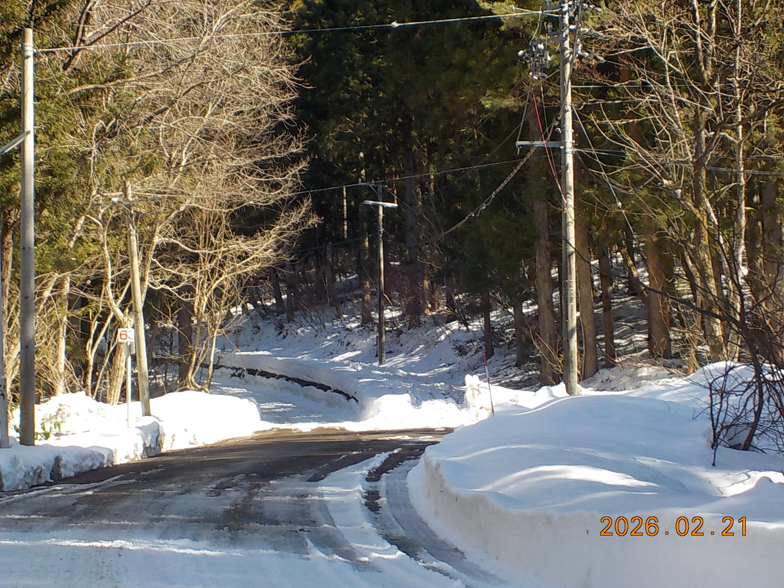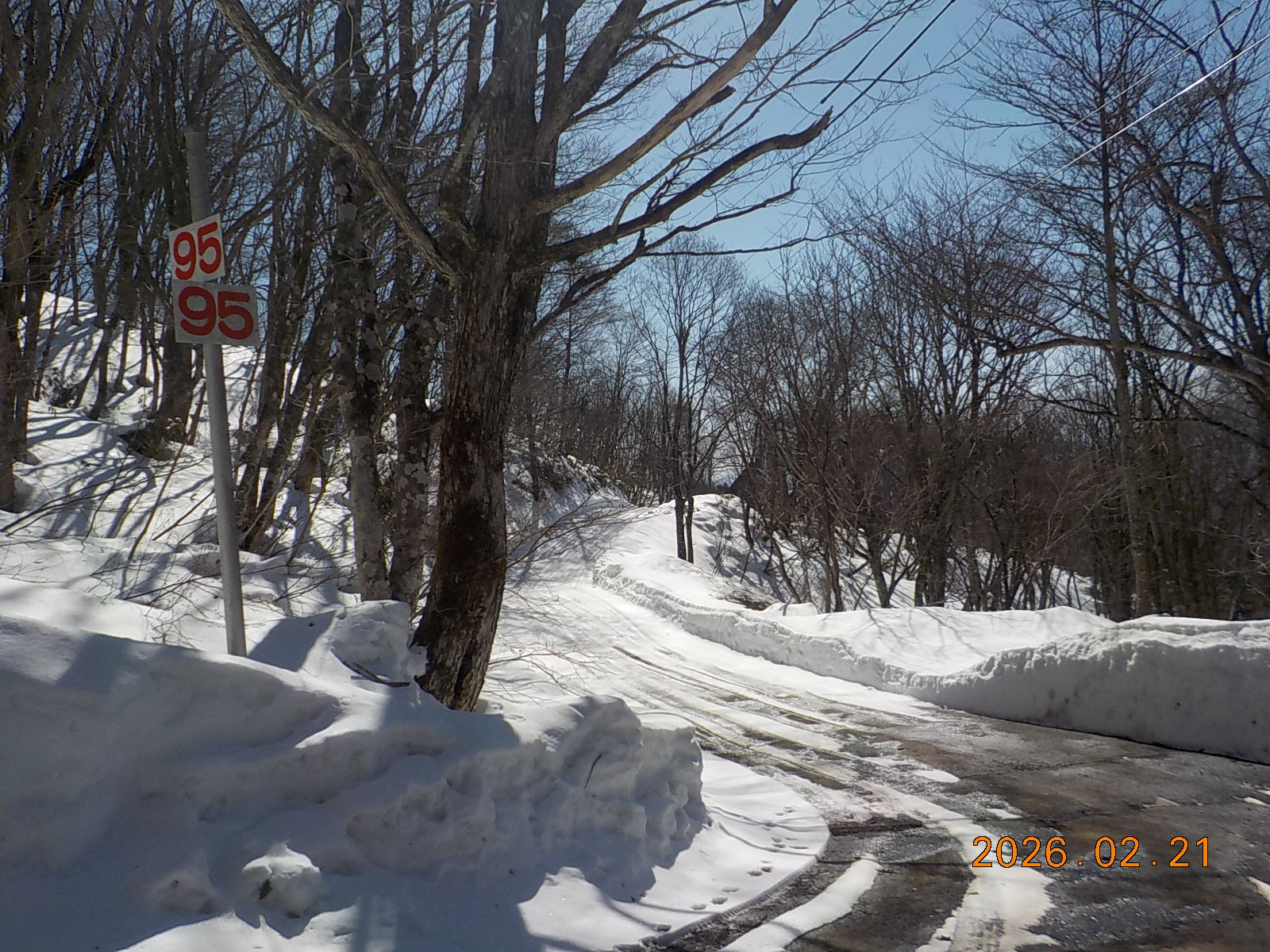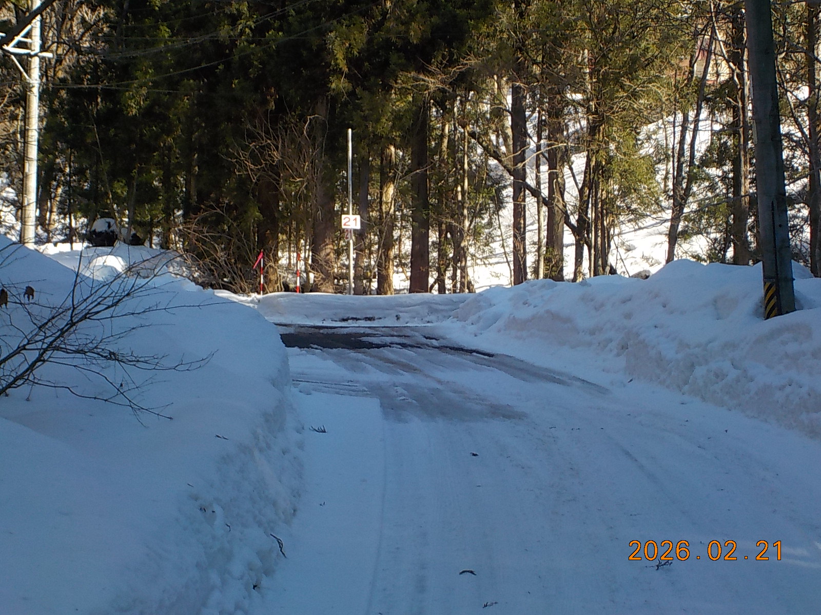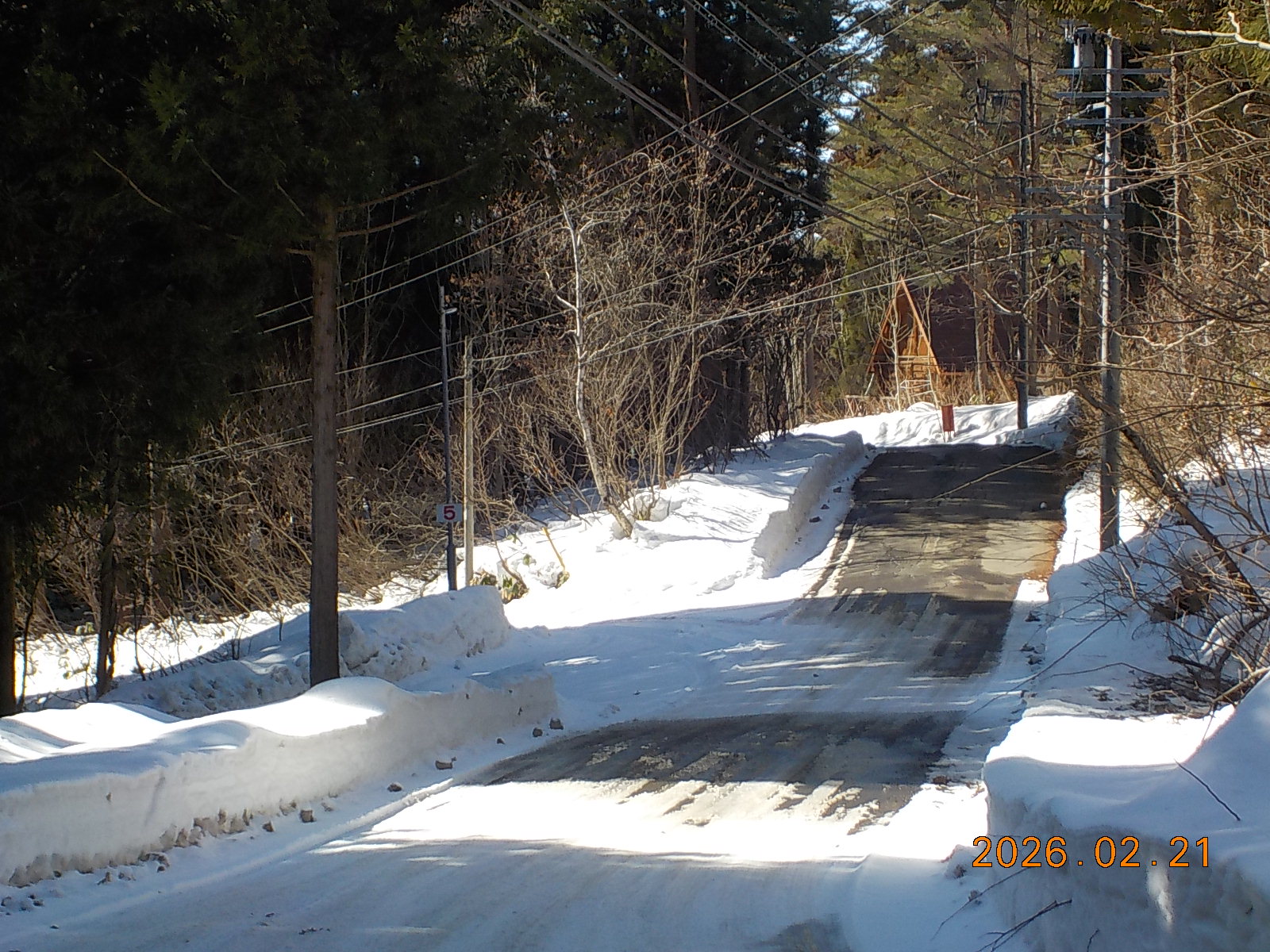場内道路の除雪が完了しております。陽当たり良いところはアスファルトが見えていますが、日陰のところでは雪が残っている場所もあります。4WD・スタッドレスタイヤを履いたお車でお越しくださいますようお願いいたします。
