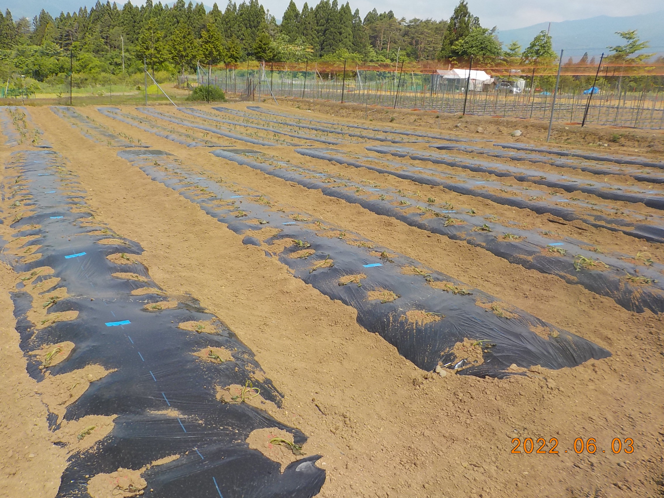 生育は、概ね良好です。トウモロコシはこれから間引きをして一本立ちにします。サツマイモは植付け直後なので萎れていますが、徐々に根が出て回復していきます。