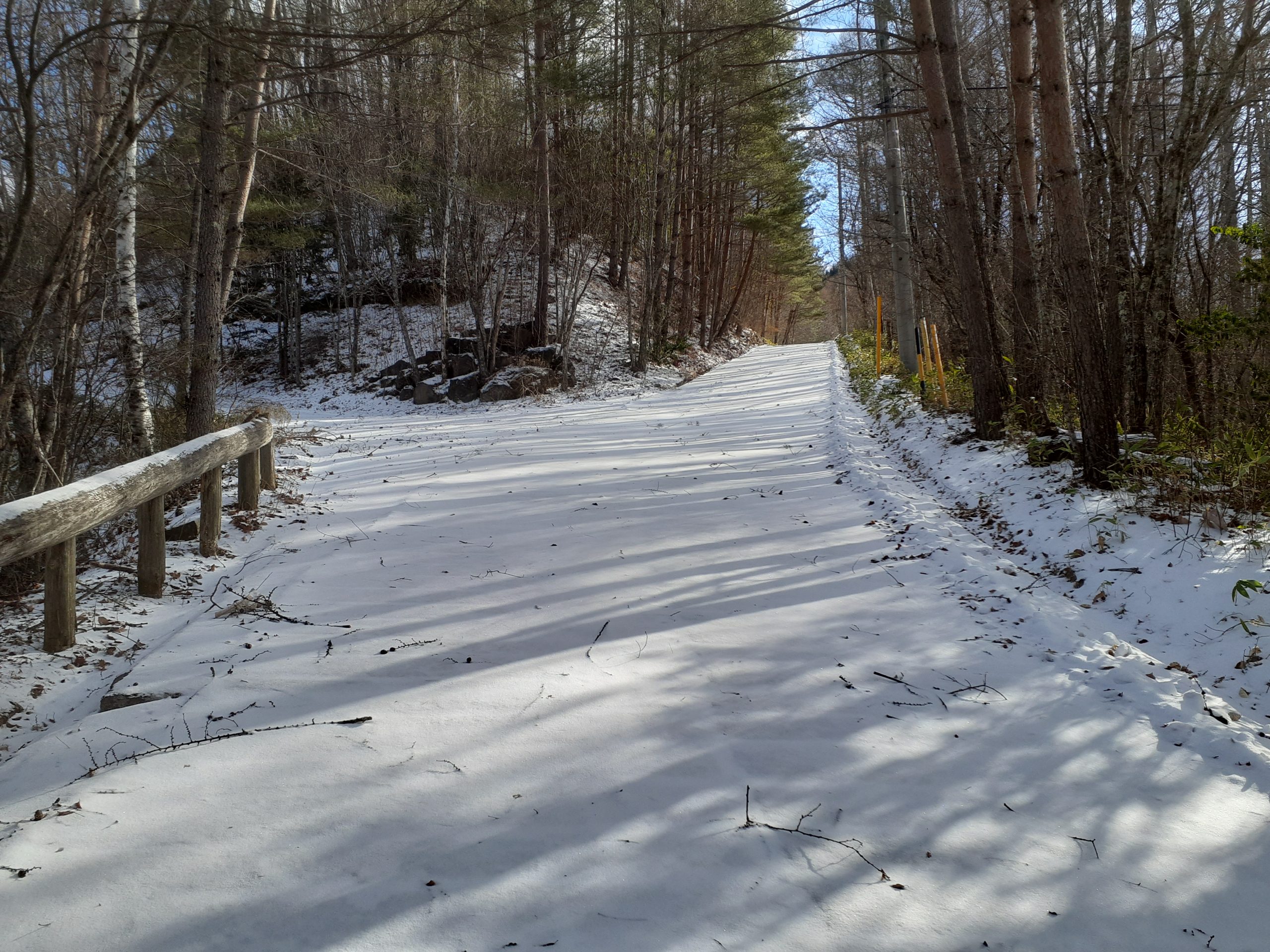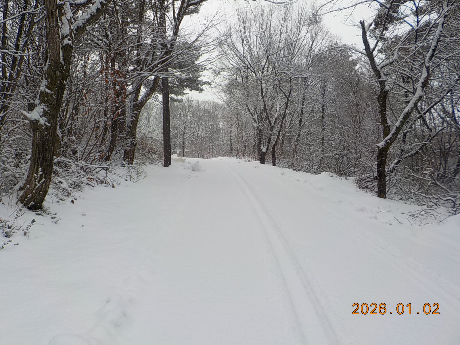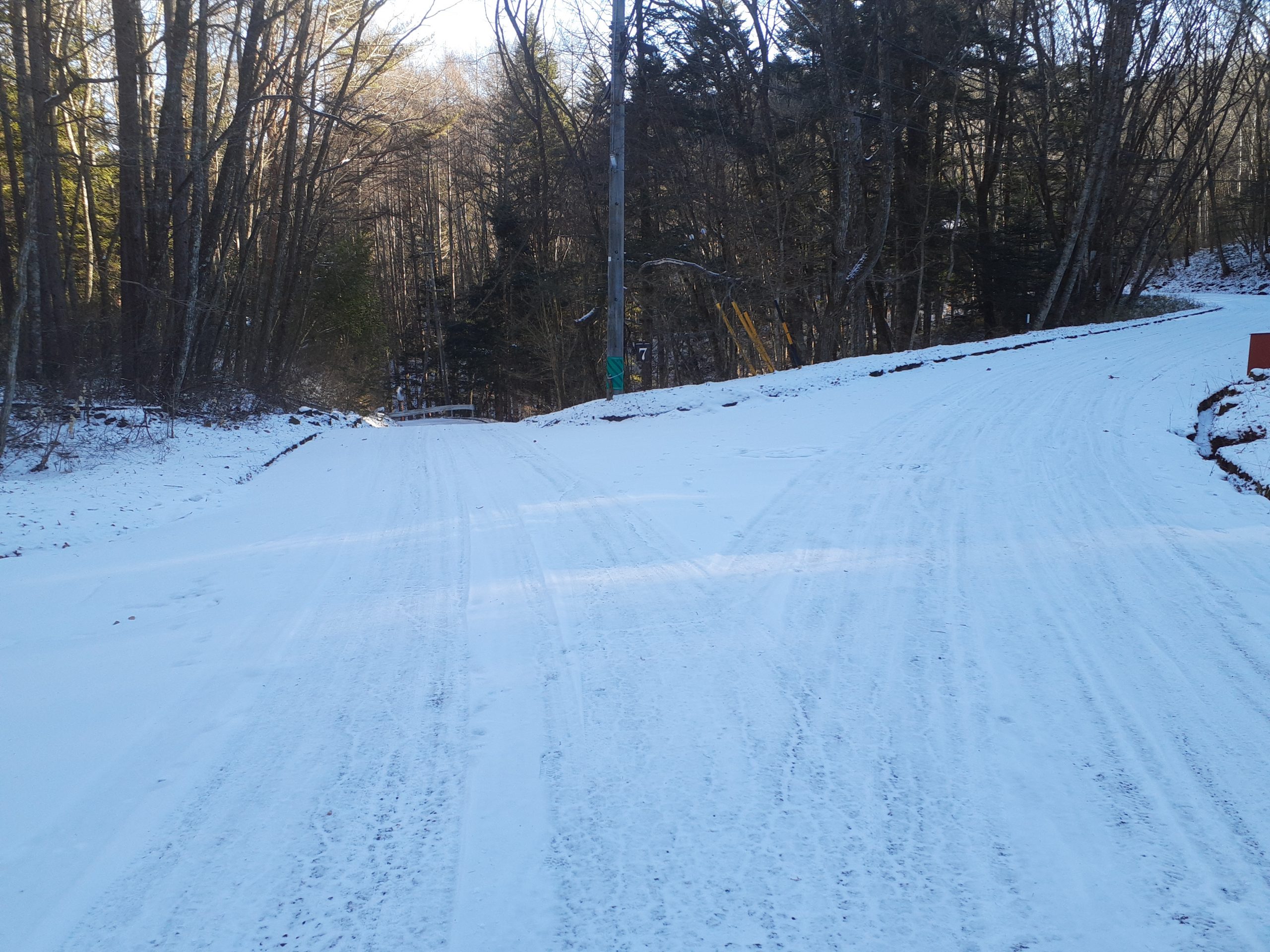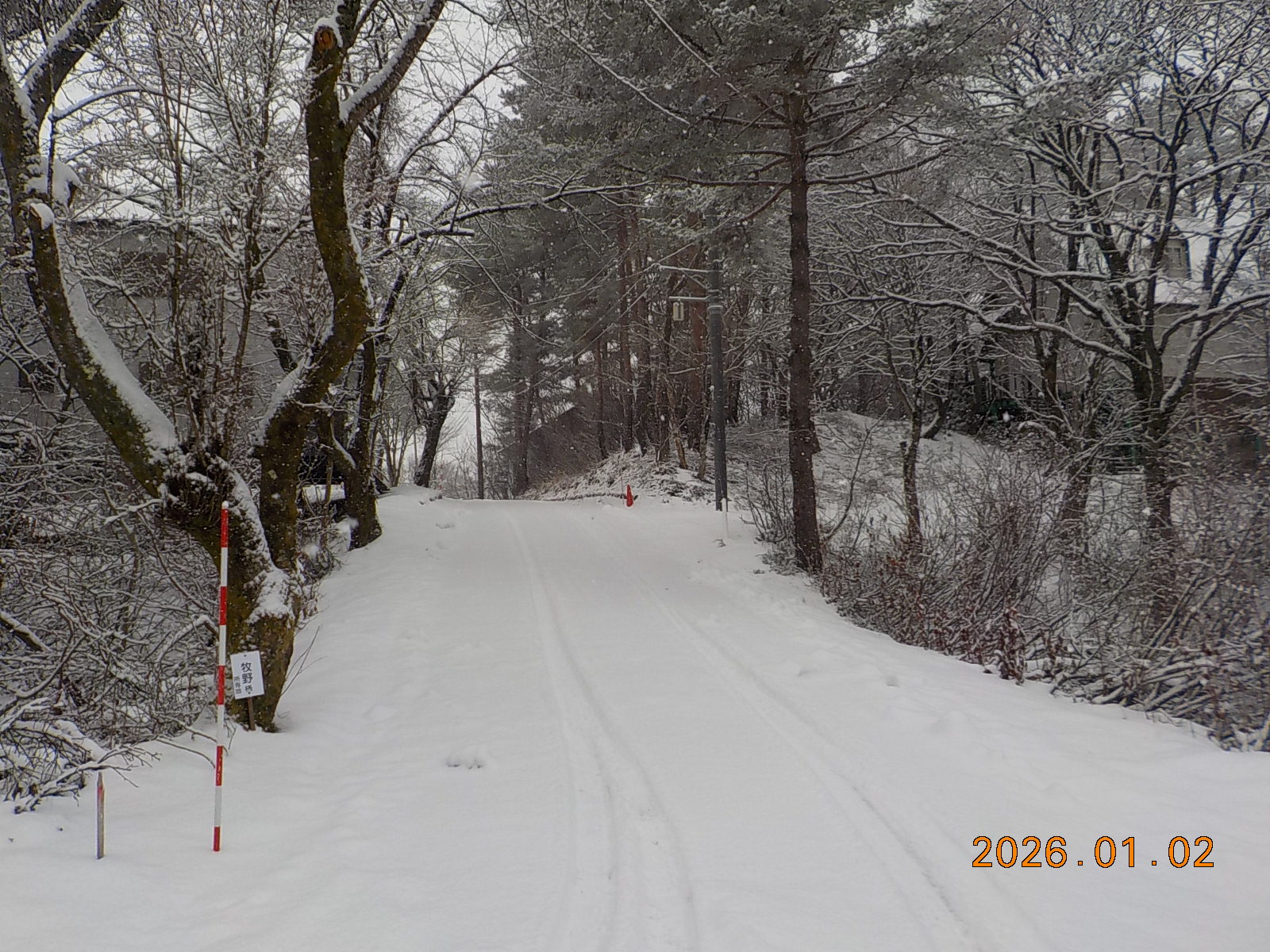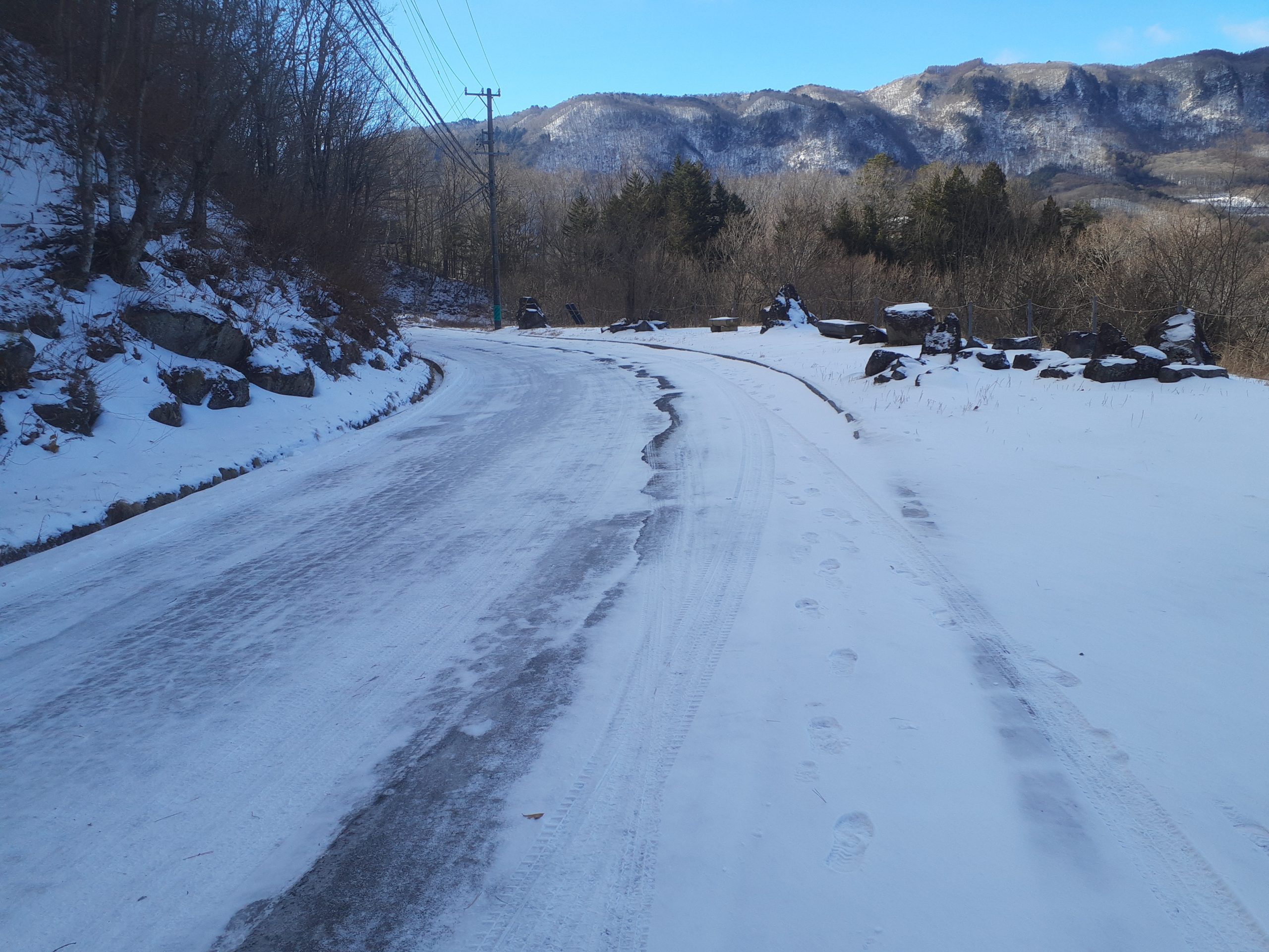 展望台より先は一面に白く雪の降った後はありますが雪の量が少なかったので路面の凍結は無いようです