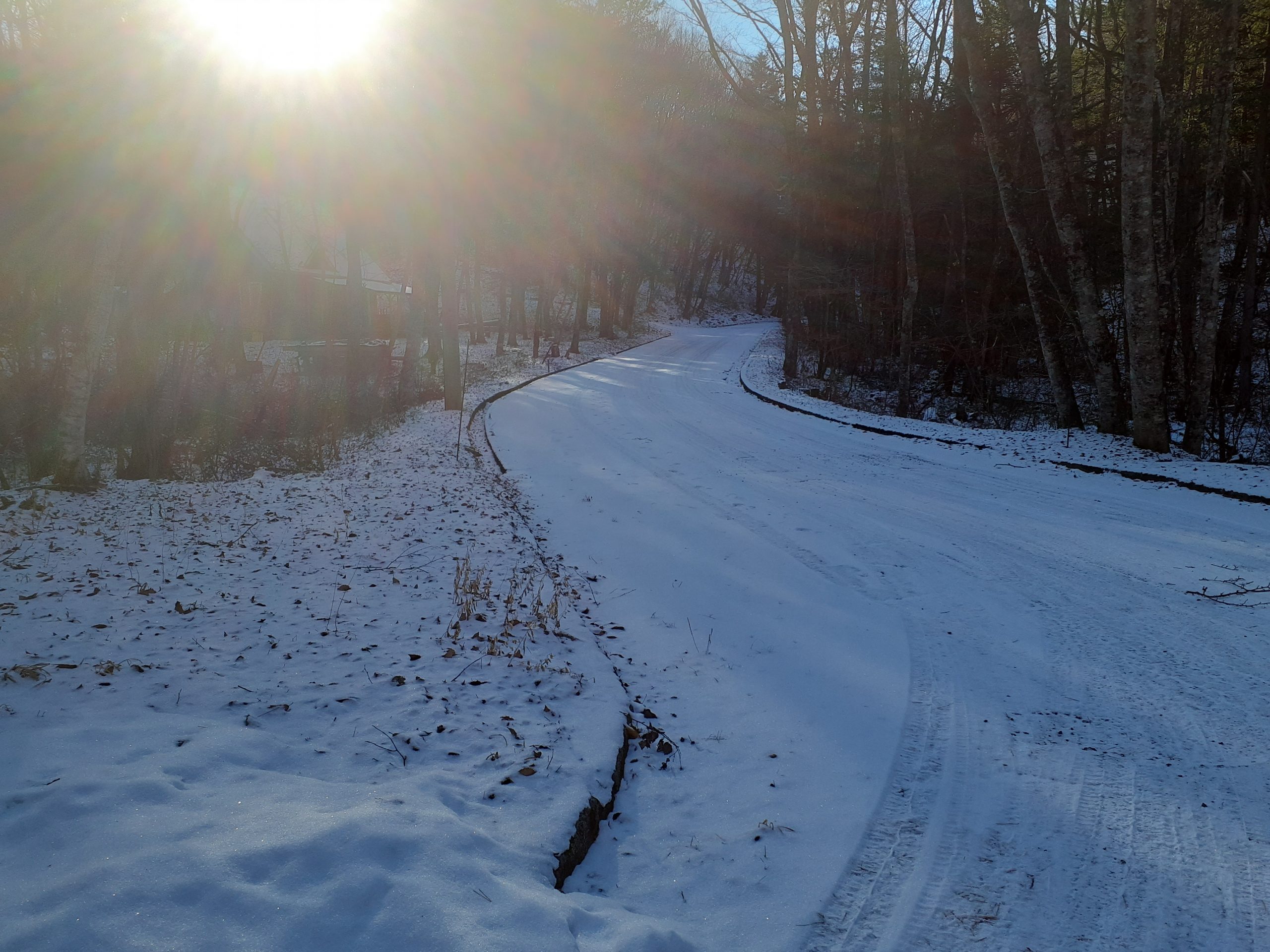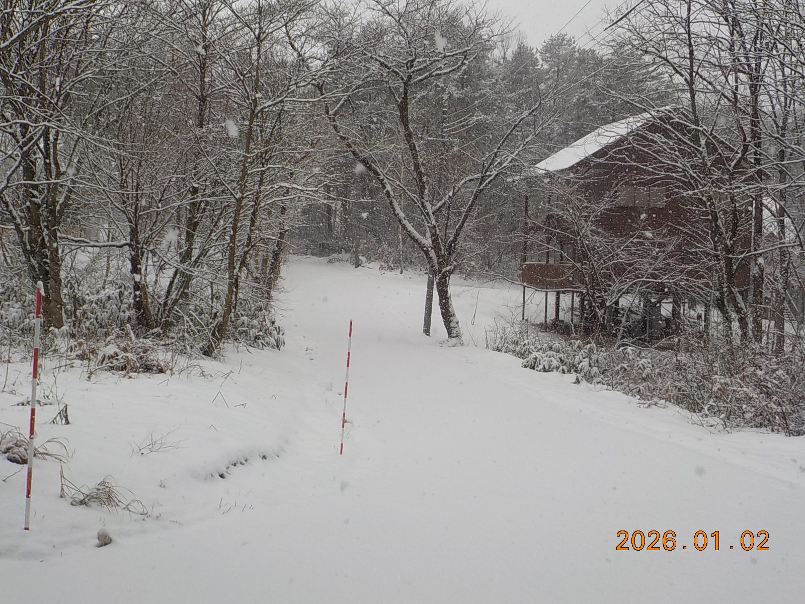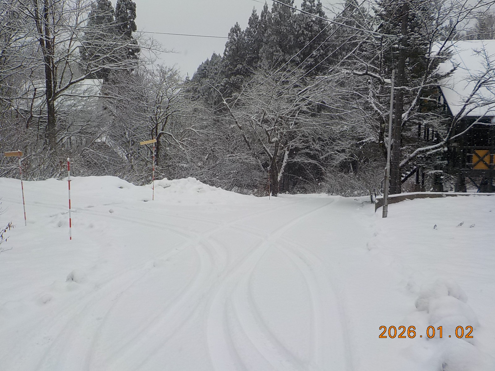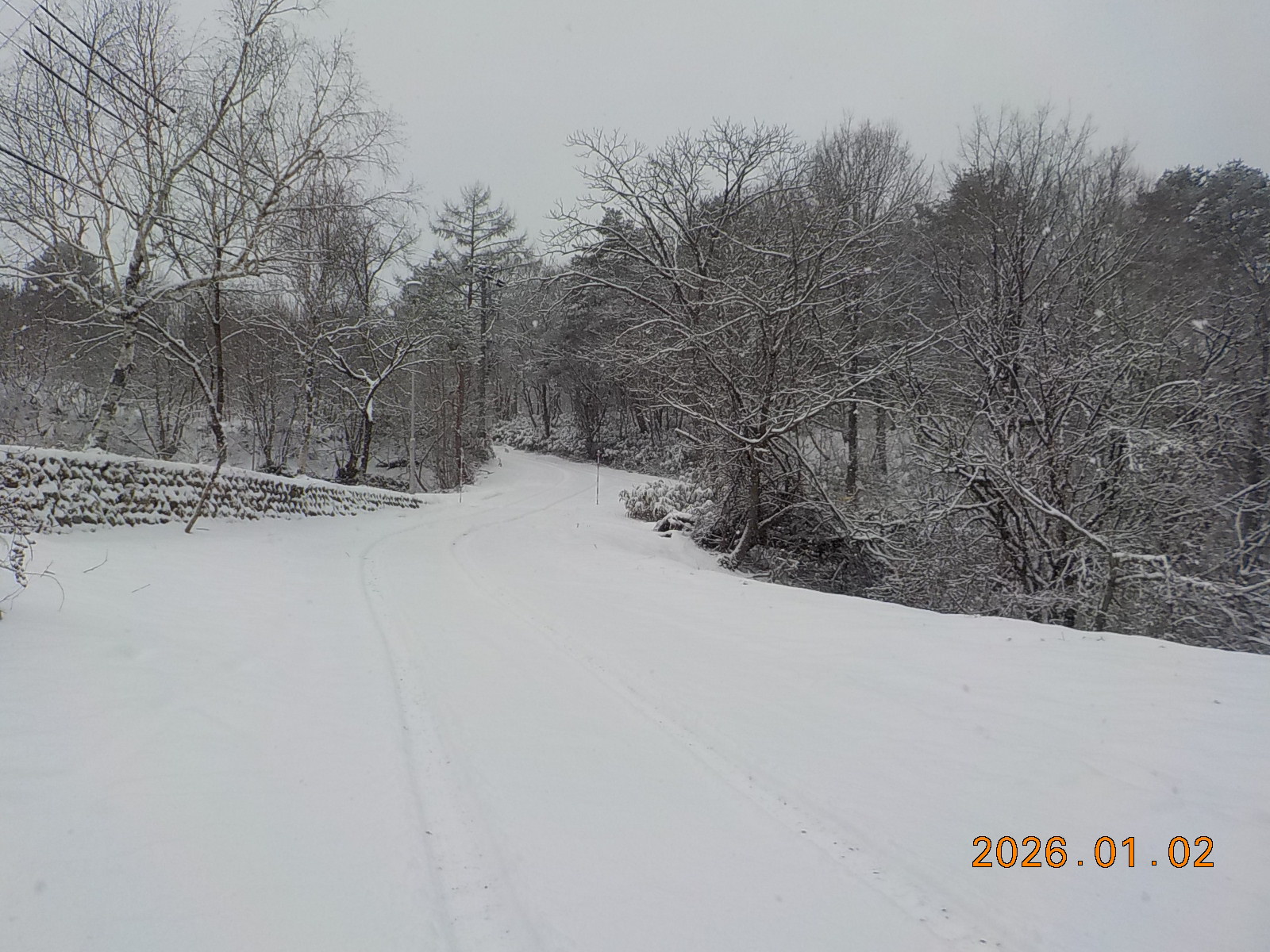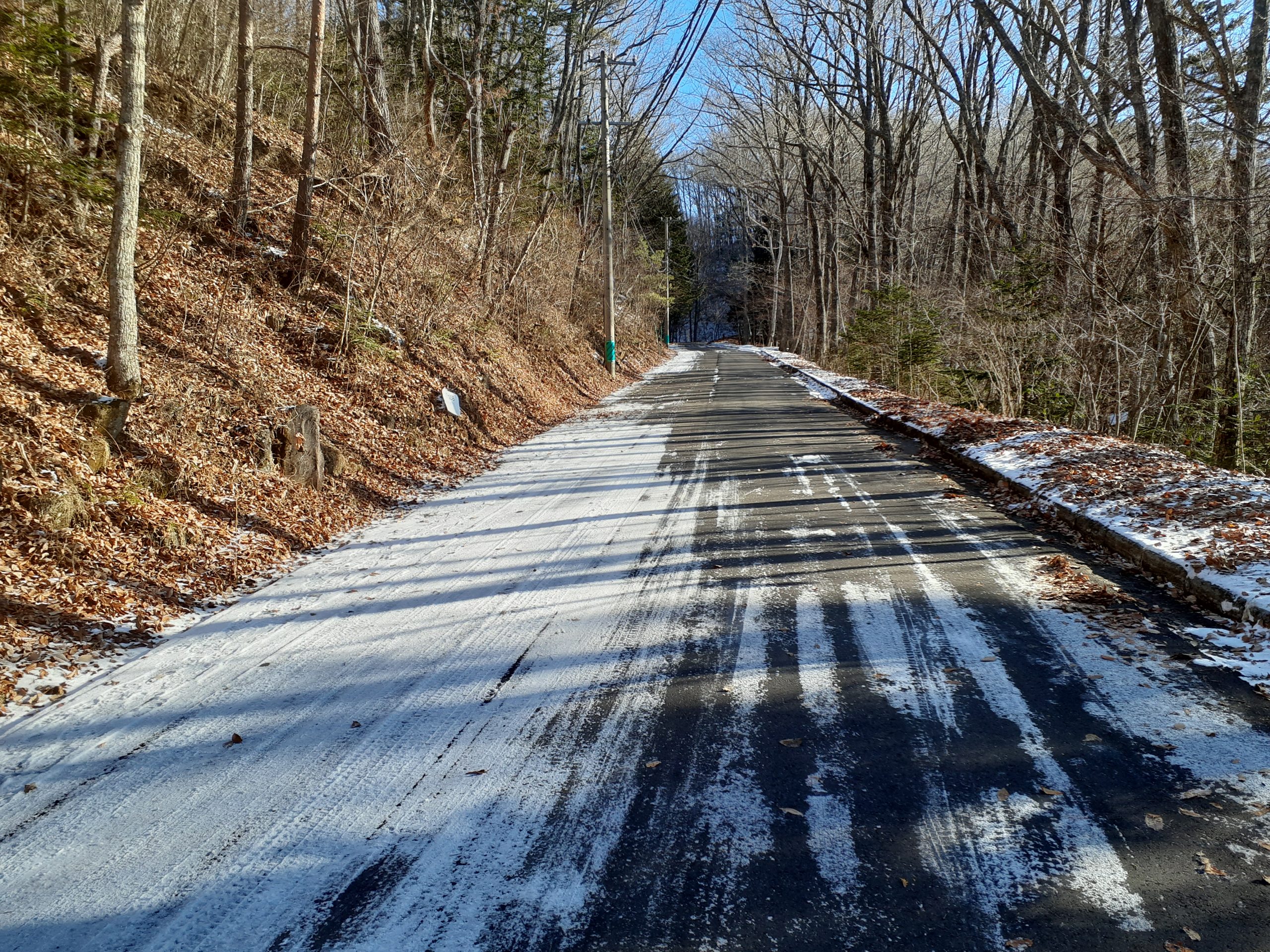 別荘地内では先日の雨で路面が凍結していますがうっすら積もった乾燥した雪のおかげもあり滑りにくくなっています